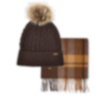Foley Set in der Farbe Elk von Dubarry enthält eine kabelgestrickte Kaschmir-Mischmütze mit Kunstpelzbommel und einen passenden 100% Wollschal im Karomuster. Wird in einer eleganten Geschenkbox geliefert - ein perfektes Wintergeschenk.