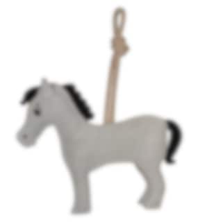 Pferdespielzeug ist sehr beliebt geworden und hier folgen wir dem Trend mit einem superschönen kleinen grauen Pferd mit schwarzer Mähne und Schweif. Das Wildledermaterial des Pferdespielzeugs ist robust und ein Seil dient als Aufhängung.