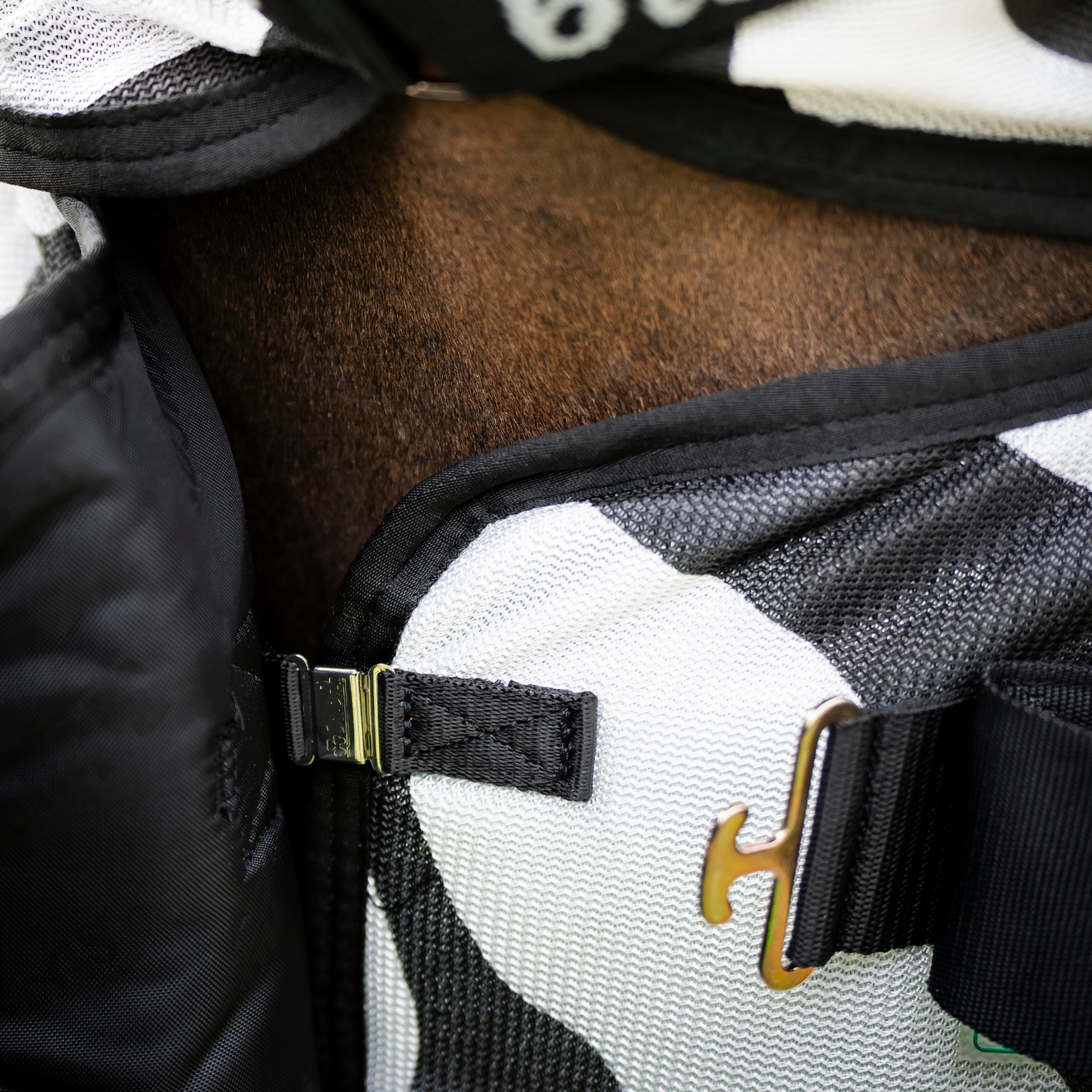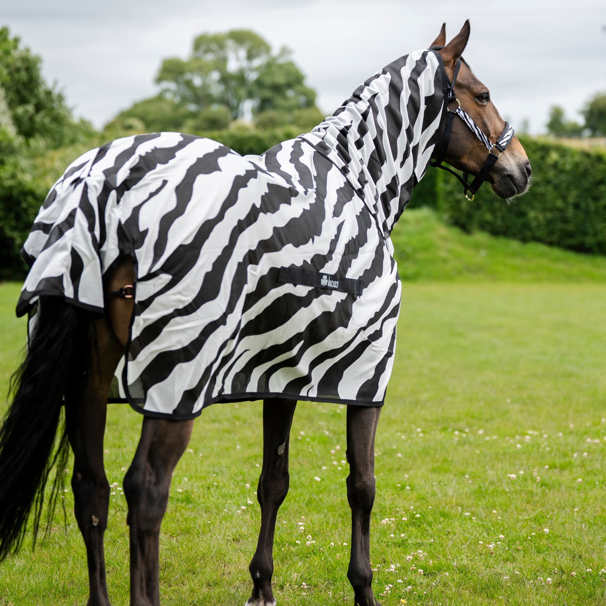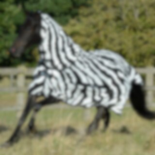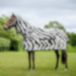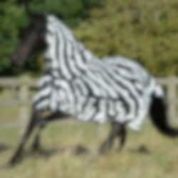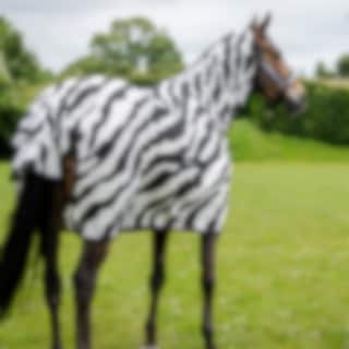 Buzz-off & Neck Zebra ist eine zebrafarbene Fliegendecke, die entwickelt wurde, um Ihr Pferd maximal vor stechenden und beißenden Insekten zu schützen. Das Muster der Fliegendecke wurde entwickelt, um lästige Insekten zu verwirren, die aufgrund des schwarz/weißen Musters nicht auf dem Pferd landen können. An der Brust und den Schultern hat die Fliegendecke ein seidiges Futter, um Scheuern zu verhindern, und der obere Teil des Schweifs ist mit einem Schweifbesatz bedeckt. Der Hals ist abnehmbar, was bedeutet, dass Sie wählen können, ob Ihr Pferd ihn tragen soll oder nicht. Die Bauchplatte aus Netz hält die Decke an Ort und Stelle und schont zudem den Magen des Pferdes.