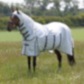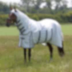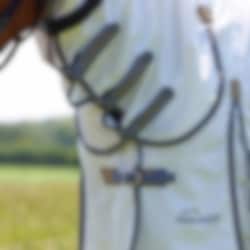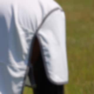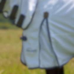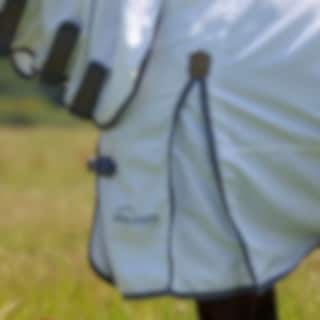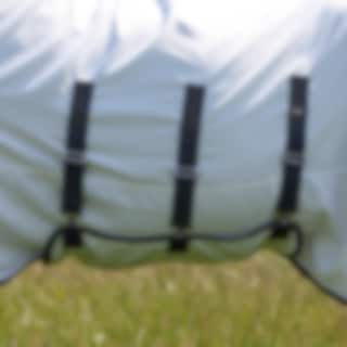 Die Decke verfügt über einen integrierten Halsteil mit Ohröffnungen sowie eine große Schweifabdeckung, die hilft, Körper, Hals, Schweifansatz und Genick zu bedecken. Das strapazierfähige und atmungsaktive Material lässt Luft zirkulieren und schützt gleichzeitig vor Sonnenbrand und Ausbleichen. Die Bauchklappe bietet Schutz unter dem Bauch und tiefe Schulterfalten sorgen für gute Bewegungsfreiheit. Die Decke wird vorne mit Schnallen geschlossen und verfügt über einen verstellbaren Schweifriemen sowie Befestigungen für Beinschnüre.