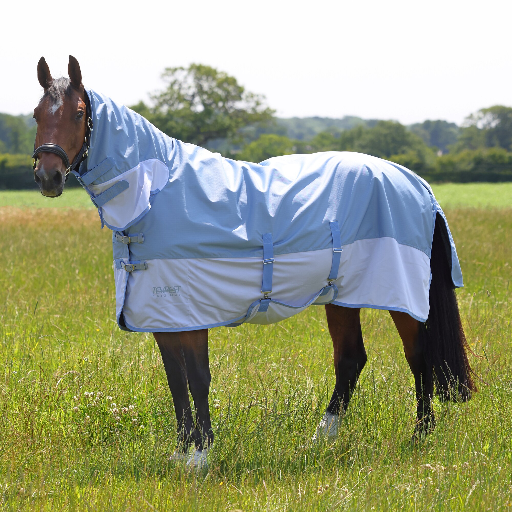 Die Decke verfügt über eine wasserdichte Oberseite aus strapazierfähigem 600 Denier Ripstop mit einer Wassersäule von 3000 mm, sodass Regen einfach abläuft. Die schnell trocknenden Mesh-Seitenteile lassen Luft zirkulieren und sorgen für gute Belüftung, mit einer Atmungsaktivität von 3000 g/m². Die Decke wird vorne mit Schnallen geschlossen, hat einen festen Halsteil sowie einen verstellbaren Schweifriemen und eine extra große Schweifabdeckung. Das Material bietet zudem einen Schutz vor Sonneneinstrahlung mit bis zu 90 % UV-Schutz.