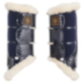 Härligt mjuka benskydd i krokolackerat konstläder med mjuk fluffigt insida. Benskydden knäpps med elastiska kardborreband.