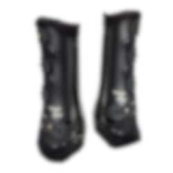 Hier in Form eines Sehnenschutzes aus Neopren, der nach den Beinen des Pferdes geformt ist und einen verstärkten Schutz für die empfindlichen Sehnen bietet. Die Gamaschen sind einfach zu verwenden und werden mit 4 elastischen Schnellknöpfen verschlossen. Das Neoprengewebe hat eine gute Belüftungsfähigkeit und hält die Beine des Pferdes während des Rittes richtig temperiert. Innen perforiert für erhöhte Luftzirkulation. Extra starkes Gummiband mit Messingknöpfen und Verstärkung an der Unterseite der Schoner. Die Länge macht die Gamaschen besonders für Dressurpferde geeignet.