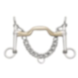 Das KK-Kandarengebiss ist 18 mm dick und mit 5 oder 7 cm langen Anzügen erhältlich. Die kürzeren Anzüge geben einen etwas direkteren Kontakt und die längeren einen etwas schärferen.