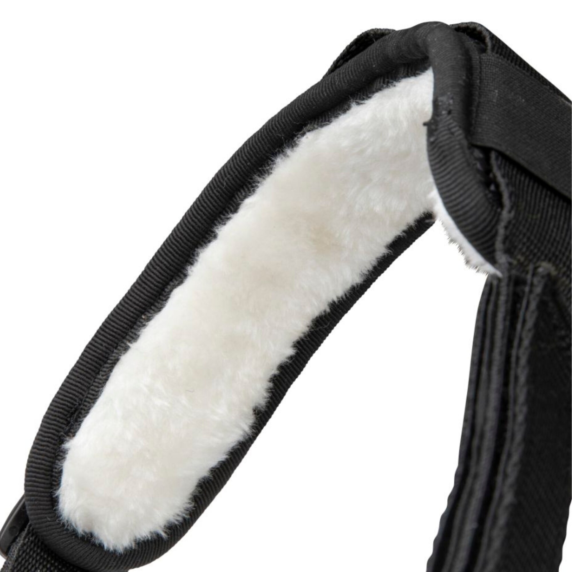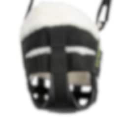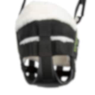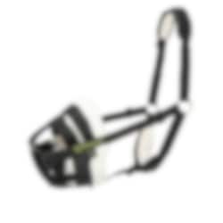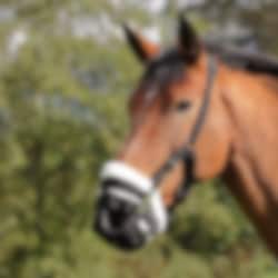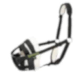 Deluxe Fressbremse mit weichem Fleecefutter und extra großen Öffnungen für die Nüstern des Pferdes. Diese Fressbremse sorgt für eine bessere Luftzufuhr, während sie gleichzeitig die Grasaufnahme während des Weidegangs reduziert.