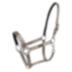 Das Halfter ist mit weichem Neopren gepolstert, das angenehm am Genick und Nasenriemen liegt. Es ist mit silberfarbenen Beschlägen ausgestattet und verstellbar, um die Passform anzupassen.