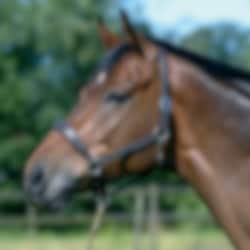 Ein schmales und elegantes, mit Leder gefüttertes Lederhalfter mit weißen Nähten und Metallschnallen von Hansbo.