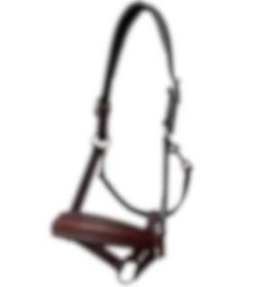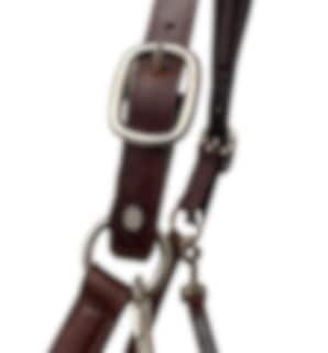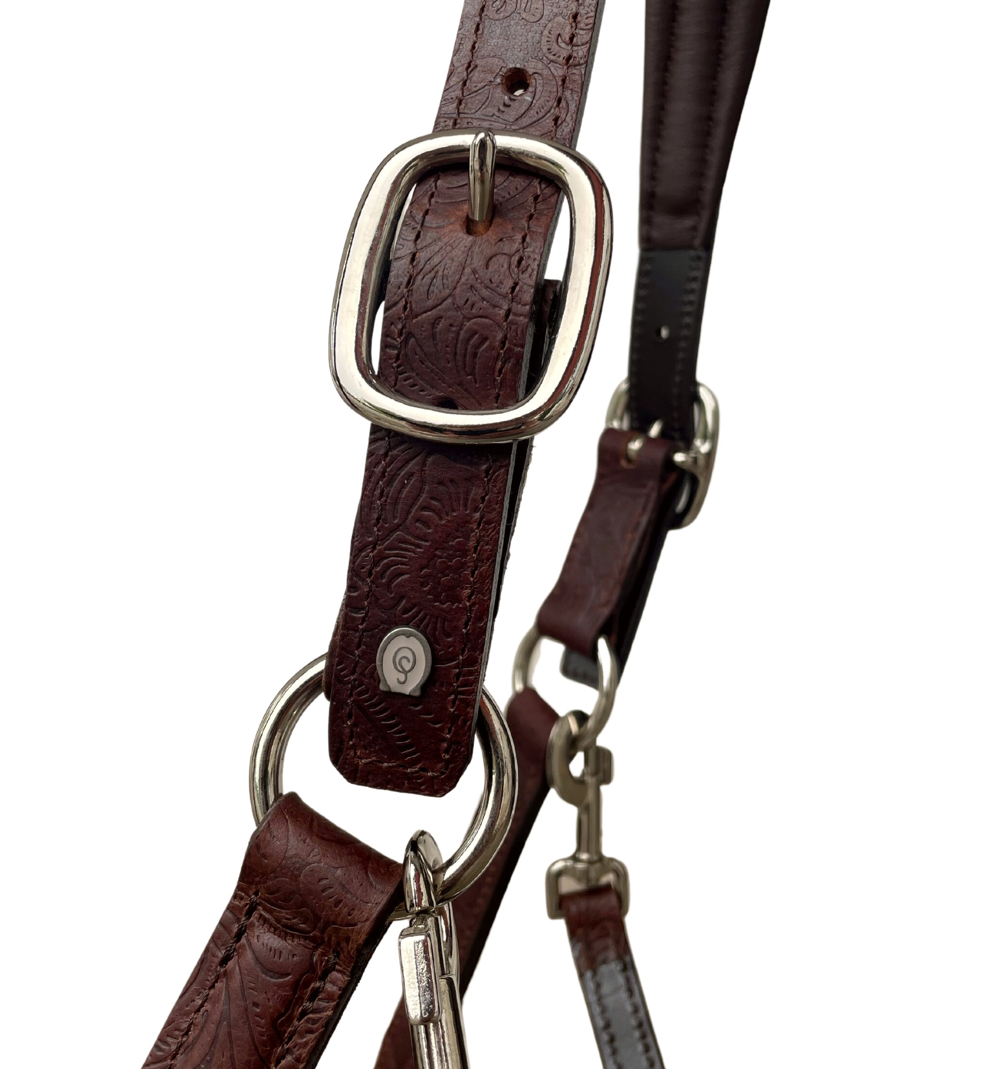 Das Lederhalfter ist breit mit weicher Polsterung im Nacken- und Nasenbereich aus braunem, exklusiv bedrucktem Leder mit brauner Polsterung, Schnallen aus Edelstahl.