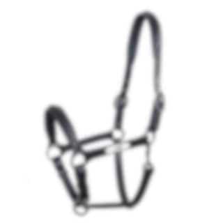 Elegantes schwarzes Lederhalfter mit weicher Polsterung und verstellbaren Riemen. Ausgestattet mit einer Logoplakette und Beschlägen aus rostfreiem Stahl.
