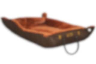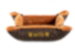 Herrlich weiches und kuscheliges Hundebett mit brauner Steppung, gefüttert mit feinstem Lammfell in der Farbe Cognac, von EA Mattes.