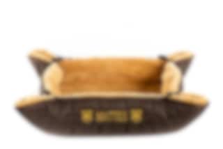 Herrlich weiches und kuscheliges Hundebett mit brauner Steppung, gefüttert mit feinstem Lammfell in der Farbe Honey, von EA Mattes.