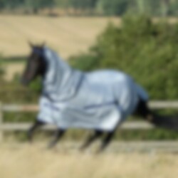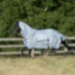 Fliegendecke mit vollständigem Halsteil und Bauchteil für besten Schutz vor Fliegen, Insekten und UV-Strahlen. Buzz Off Insekten-, Fliegen- und UV-Schutzprodukte werden aus einem speziell entwickelten, leichten und feinmaschigen Stoff hergestellt. Diese Maschengröße blockiert selbst kleinste Insekten und reduziert die Auswirkungen ultravioletter Strahlung. Buzz-Off Full-Neck bietet vollen Schutz für den gesamten Körper und Hals des Pferdes. Das innovative Bauchstück sorgt dafür, dass die Decke an Ort und Stelle bleibt und gleichzeitig den Magen des Pferdes schützt. - Die überlappende, wattierte und gefütterte Vorderseite bietet erstklassigen Komfort und Schutz. - Das einzigartige, elastische und abnehmbare Bauchstück schützt den Magen des Pferdes. - Der Schweiflatz sorgt für zusätzlichen Schutz für den Schweif. - Mitgelieferte Beinriemen Farbe: Silber mit blauen Details.