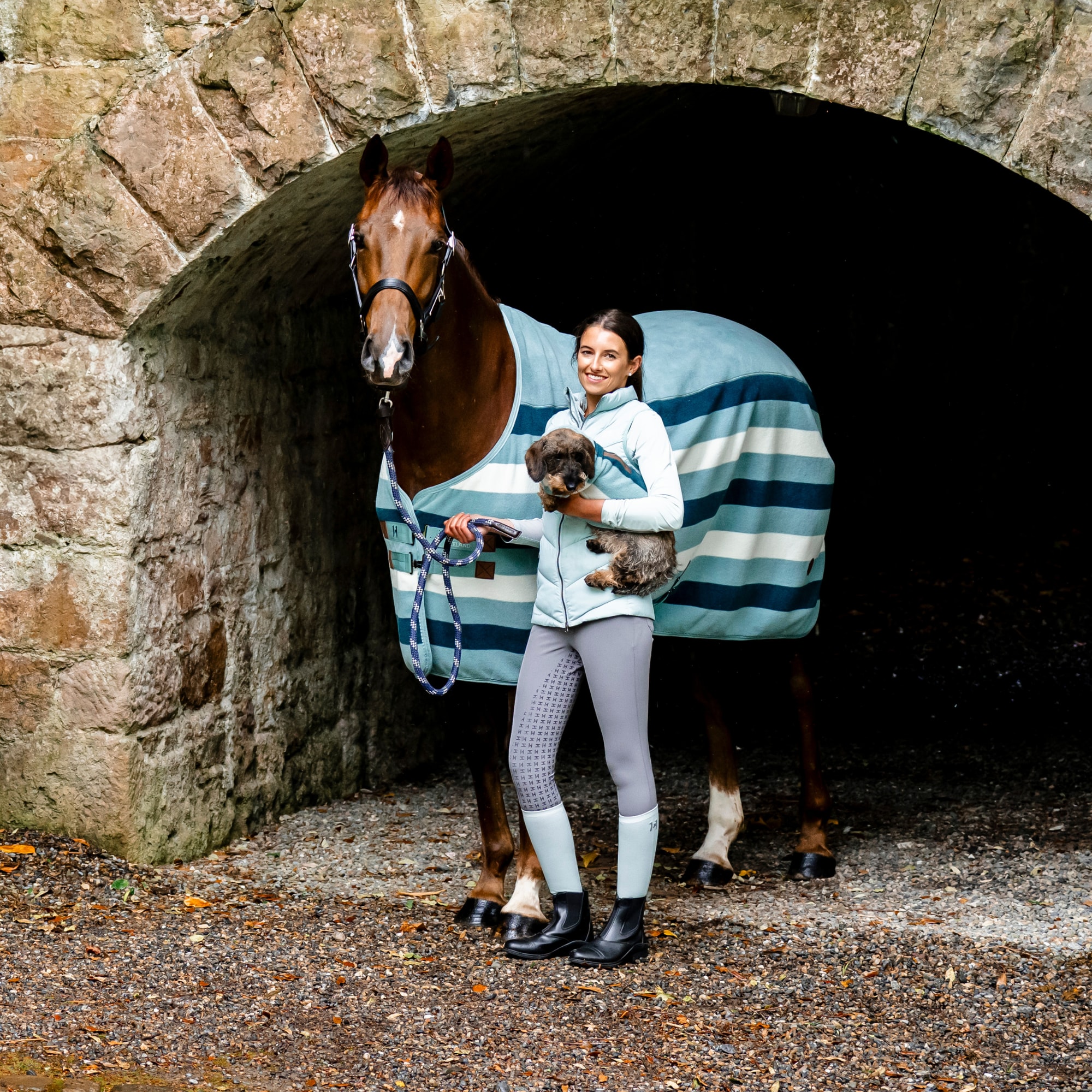 Mit ihrem klassischen Newmarket-Streifenmuster vereint die Decke zeitlose Eleganz mit praktischer Funktionalität und ist damit sowohl im Stall als auch auf dem Turnier ein stilvoller Begleiter.