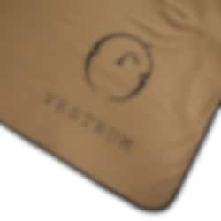 Schlichte Fleecedecke von Vestrum aus hochwertigem Material, die das Pferd warm und trocken hält, elegant designt in einer wunderschönen Sandfarbe mit schwarzer Kante und Logo.