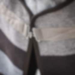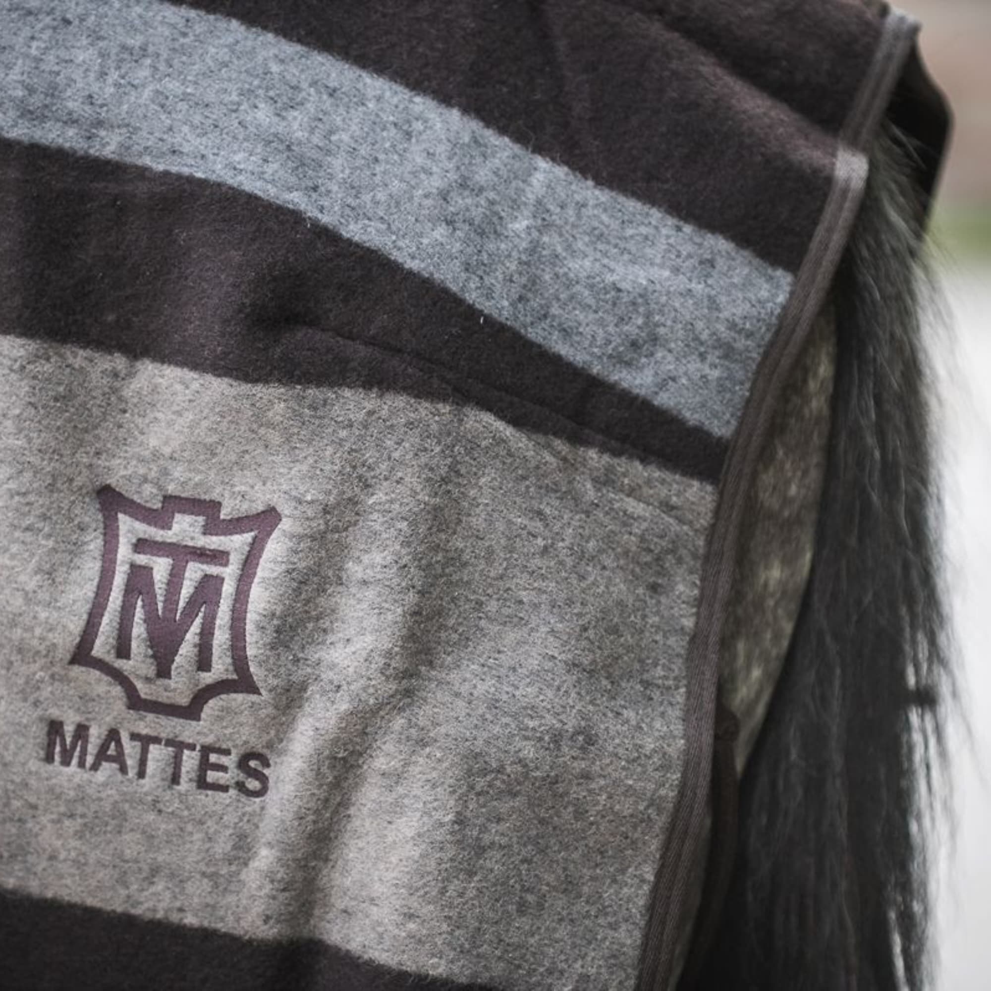 Die Woll-Decke hat eine stilvolle braune Basis mit grauen Streifen und eine elegante braune Paspel, die ihr einen klassischen und zeitlosen Look verleiht. Vorne ist sie mit einem praktischen Verschluss ausgestattet, der die Decke sicher hält. Die Decke verfügt über einen Schweifriemen sowie das Mattes-Logo entlang des Rückens. Sie ist sowohl strapazierfähig als auch bequem – eine ausgezeichnete Wahl für den täglichen Gebrauch.