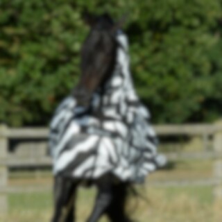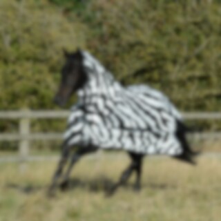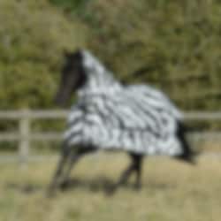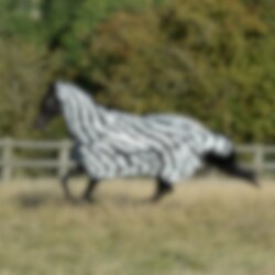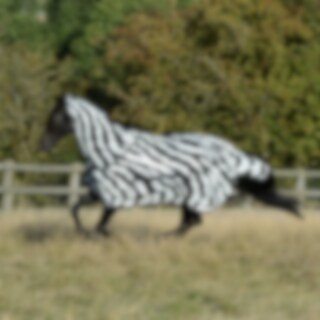 Zebragestreifte Fliegendecke von Bucas mit Hals- und Bauchstück aus dem weichsten Netzstoff. Zebrastreifen sind ein Muster, mit dem Fliegen weiter abgeschreckt werden. Buzz off Zebra ist eine sehr beliebte Alternative unter Fliegendecken und die Farbkombination hat sich als sehr effektiv gegen Fliegen erwiesen.