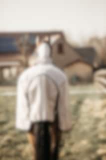 Das Material der Meshdecke ist stark, aber Sie hat dennoch eine gute Atmungsaktivität, sodass Ihr Pferd immer noch eine Brise frischer Luft genießen kann. Die Innenseiten von Brust, Nacken und Schweif haben ein glattes Innenfutter, um Scheuern zu vermeiden. Die Decke ist anatomisch geformt, um die beste Passform zu gewährleisten und zu verhindern, dass die Decke während des Tages verrutscht. Die Verschnallung an der Brust hat eine dreieckige Form, um den Druck auf Widerrist und Brust zu reduzieren. Der Halsteil der Decke ist abnehmbar und hat eine Verstärkung an den Seiten, die für einen guten Halt sorgen. Der Schweifflicken ist extra groß und hat ein Gummiband, durch das Sie den Schweif fädeln können, damit die Decke nicht verrutscht. Die Bauchplatte wird mit drei Gurten verschlossen und schützt zusätzlich den Magen des Pferdes vor den Insekten.