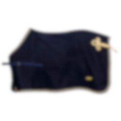 Exklusive Nierendecke von Hansbo Sport aus 700 g recycelter Wolle. Diese schöne Nierendecke lässt sich mit 2 verstellbaren Schnallen leicht am Sattel befestigen und hat einen schönen geflochtenen Schweifriemen. Farbe Marineblau mit marineblauen Saum und goldenen Paspeln und goldfarbenen Flechtmuster.