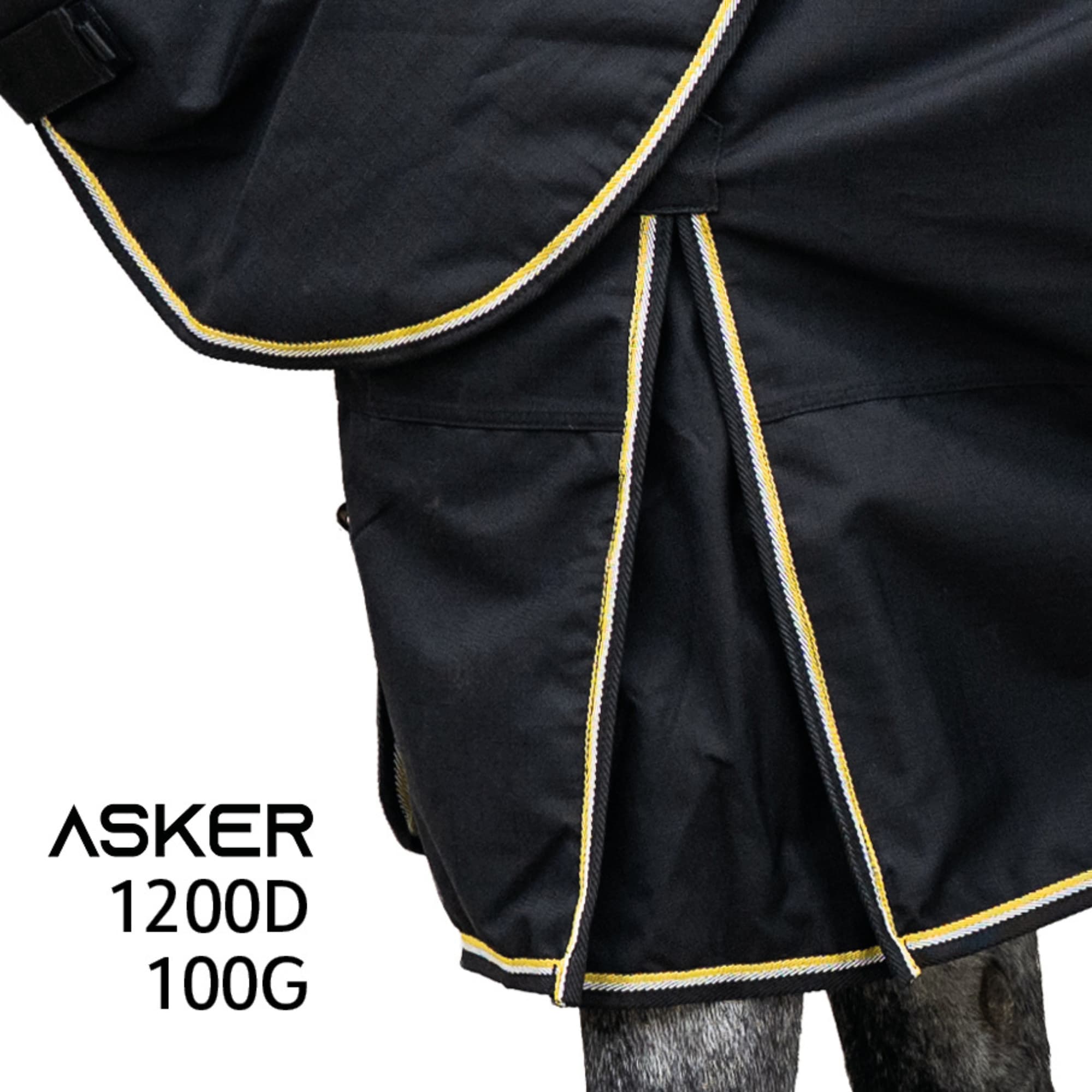 Asker TO Plus 1200D 100g in Schwarz ist eine strapazierfähige Regendecke, die Ihrem Pferd Schutz vor Nässe und Wind zu jeder Jahreszeit bietet. Die Decke ist aus extra starkem 1200 Denier-Material gefertigt, was sie besonders widerstandsfähig für Pferde macht, die sich viel auf der Weide bewegen. Mit einer Wasserdichtigkeit von 3000 WP und einer sehr guten Atmungsaktivität bleibt das Pferd auch bei längeren Regen- oder Feuchtwetterperioden trocken und komfortabel.