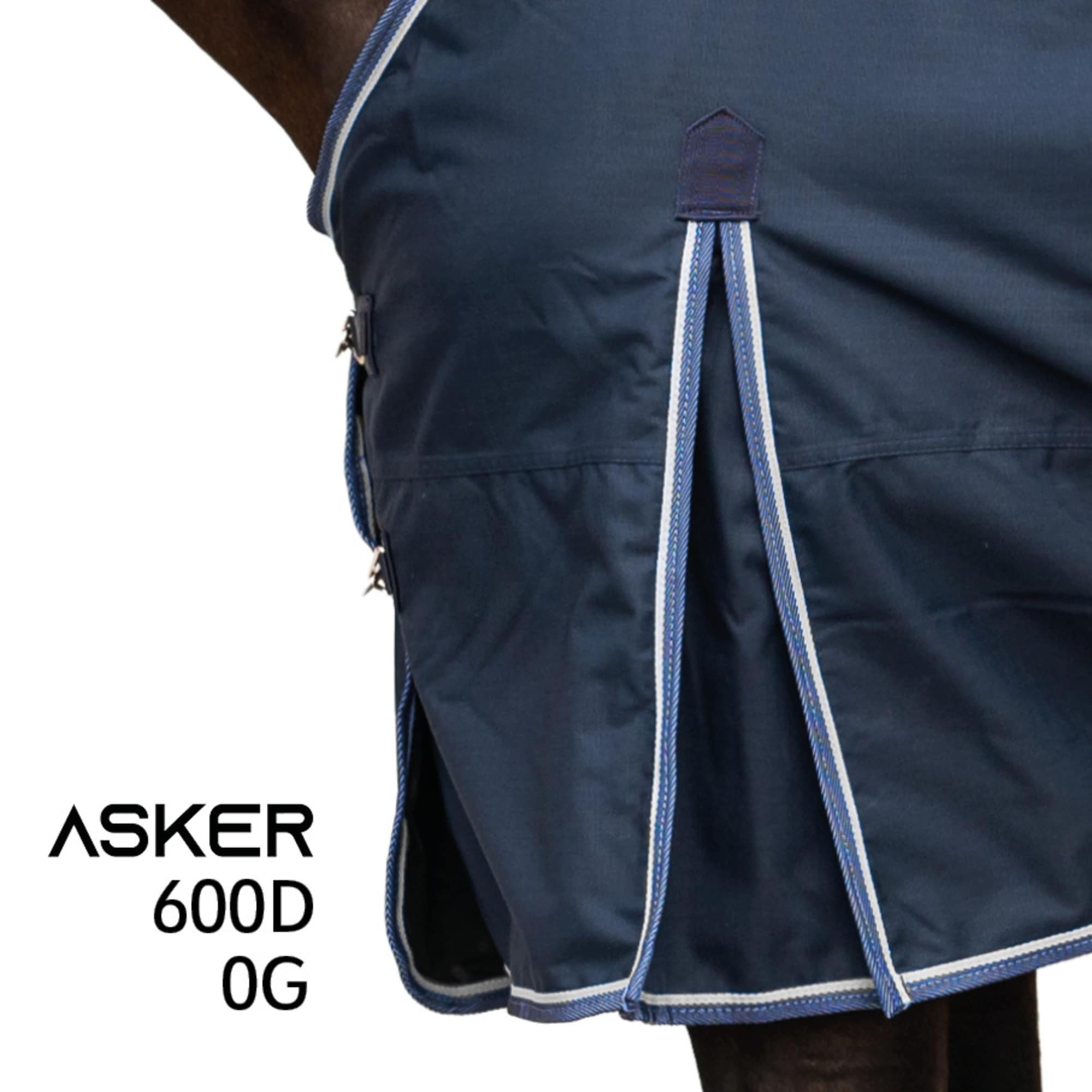 Asker Turn Out Rug SN - 0g in der Farbe Marineblau ist eine funktionale und langlebige Outdoordecke, die sich bestens für den täglichen Einsatz bei unterschiedlichen Wetterbedingungen eignet. Die Decke besteht aus 600-Denier-Material und bietet eine Wasserdichtigkeit von 3000 WP in Kombination mit guter Atmungsaktivität, was für ein angenehmes Klima für das Pferd sorgt.