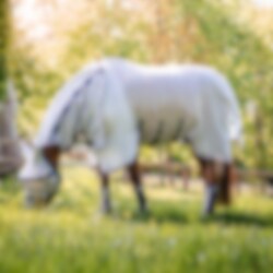 Die Decke liegt nah am Pferd an, hat einen abnehmbaren Hals und eine erweiterte Abdeckung, die maximalen Schutz vor Fliegen und Insekten bietet. Der V-Frontverschluss ermöglicht es Ihrem Pferd auch bequem zu grasen und beseitigt Druck und Scheuern an der Brust. Rambo Protector bietet auch 65% UV-Schutz, was für empfindliche Pferde sehr gut ist.