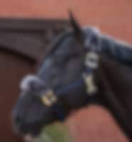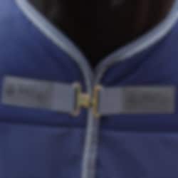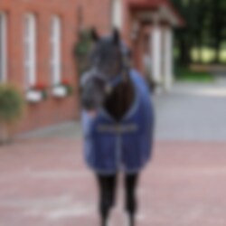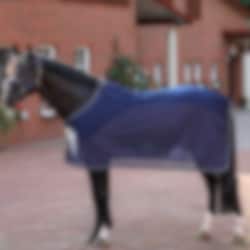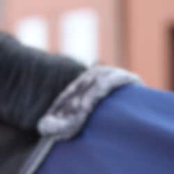 Die Decke hat Kunstfell am Widerrist, eine T-Schnalle vorne, abnehmbare Kreuzgurte, die auf der Innenseite der Deck sitzen, und einen Schweifriemen. Das Design der Decke ist anspruchsvoll und elegant und passt zur Show-Line-Serie von Bucas: Marineblau mit Kunstfell und kontrastierendem Rand.