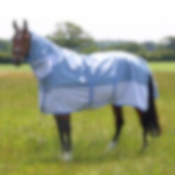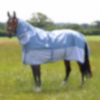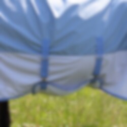 Die Decke verfügt über eine wasserdichte Oberseite aus strapazierfähigem 600 Denier Ripstop mit einer Wassersäule von 3000 mm, sodass Regen einfach abläuft. Die schnell trocknenden Mesh-Seitenteile lassen Luft zirkulieren und sorgen für gute Belüftung, mit einer Atmungsaktivität von 3000 g/m². Die Decke wird vorne mit Schnallen geschlossen, hat einen festen Halsteil sowie einen verstellbaren Schweifriemen und eine extra große Schweifabdeckung. Das Material bietet zudem einen Schutz vor Sonneneinstrahlung mit bis zu 90 % UV-Schutz.