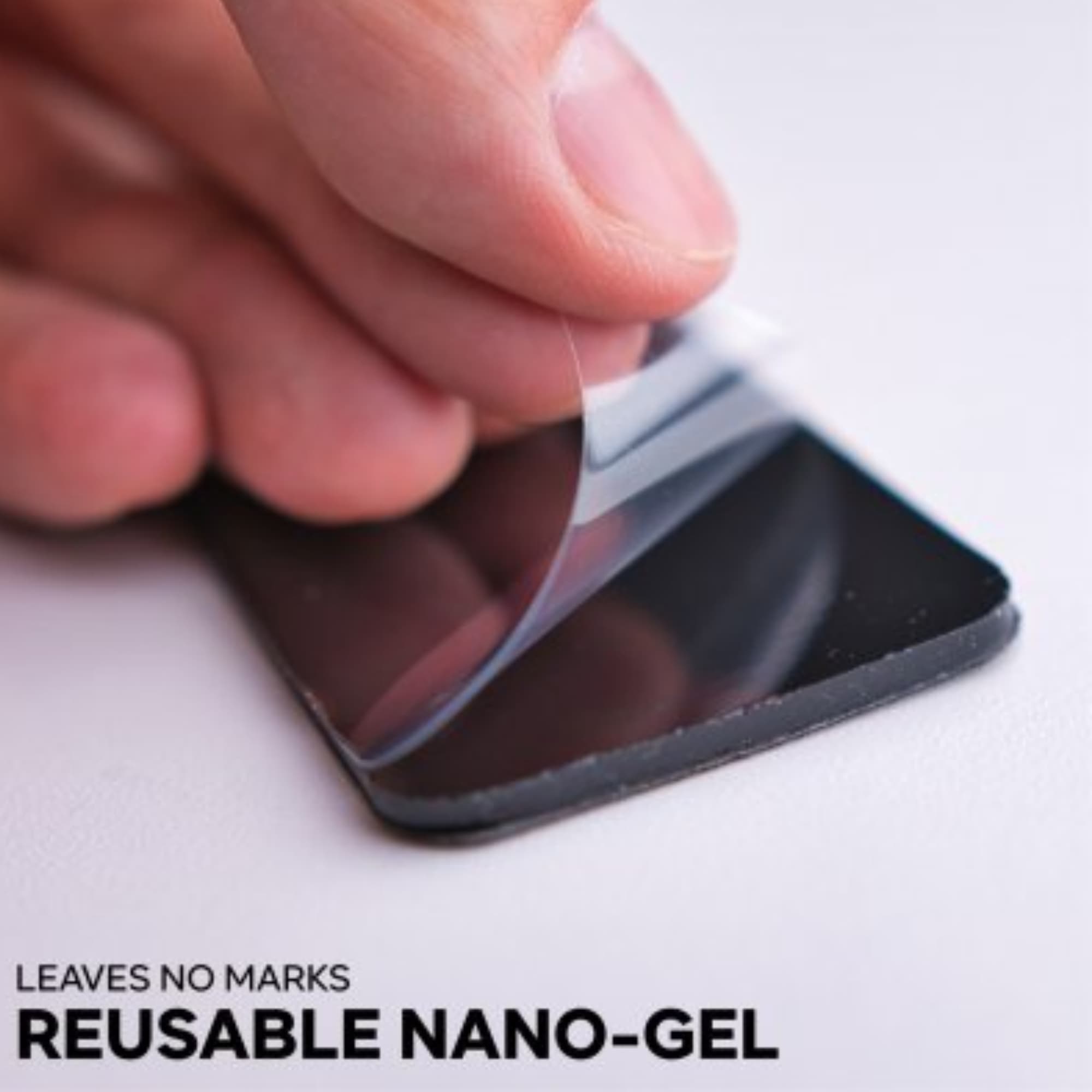 Sicher und vielseitig: Die Rückseite ist mit Nano-Gel beschichtet, das auf den meisten Oberflächen haftet, ohne Spuren zu hinterlassen.