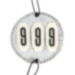 Denna tävlingsnummerlapp är 9 cm i diameter, har tre siffror samt två gummiband att fästa den i tränset eller grimman med.