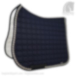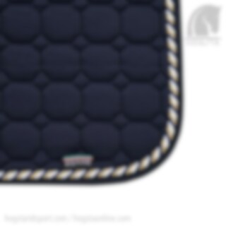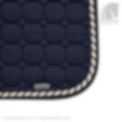 Equilines Octagon Schabracke in der Farbe Marine mit einer Naht in den Farben Marine, Gold und Weiß. Die Octagon Schabracke über das Air Control System und Shockabsorber, was dem Pferd ein hohes Maß an Komfort bietet. Die Dressur Shabracke von Equiline hat nicht nur eine gute Passform und Langlebigkeit, sondern ist auch sehr stylisch. Dies ist eine Dressur Schabracke, die die höchste Qualität bereithält.