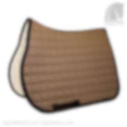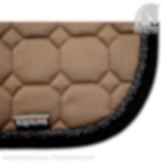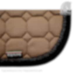 Octagon Springschabracke von Equiline. Die stilvolle Cappuccino-Farbe in Kombination mit einem schwarzen Einfassband und einem glitzernden schwarzen Kordel ergibt eine stilvolle, aber dennoch coole Schabracke.