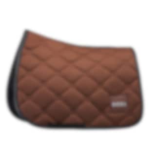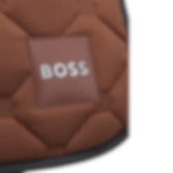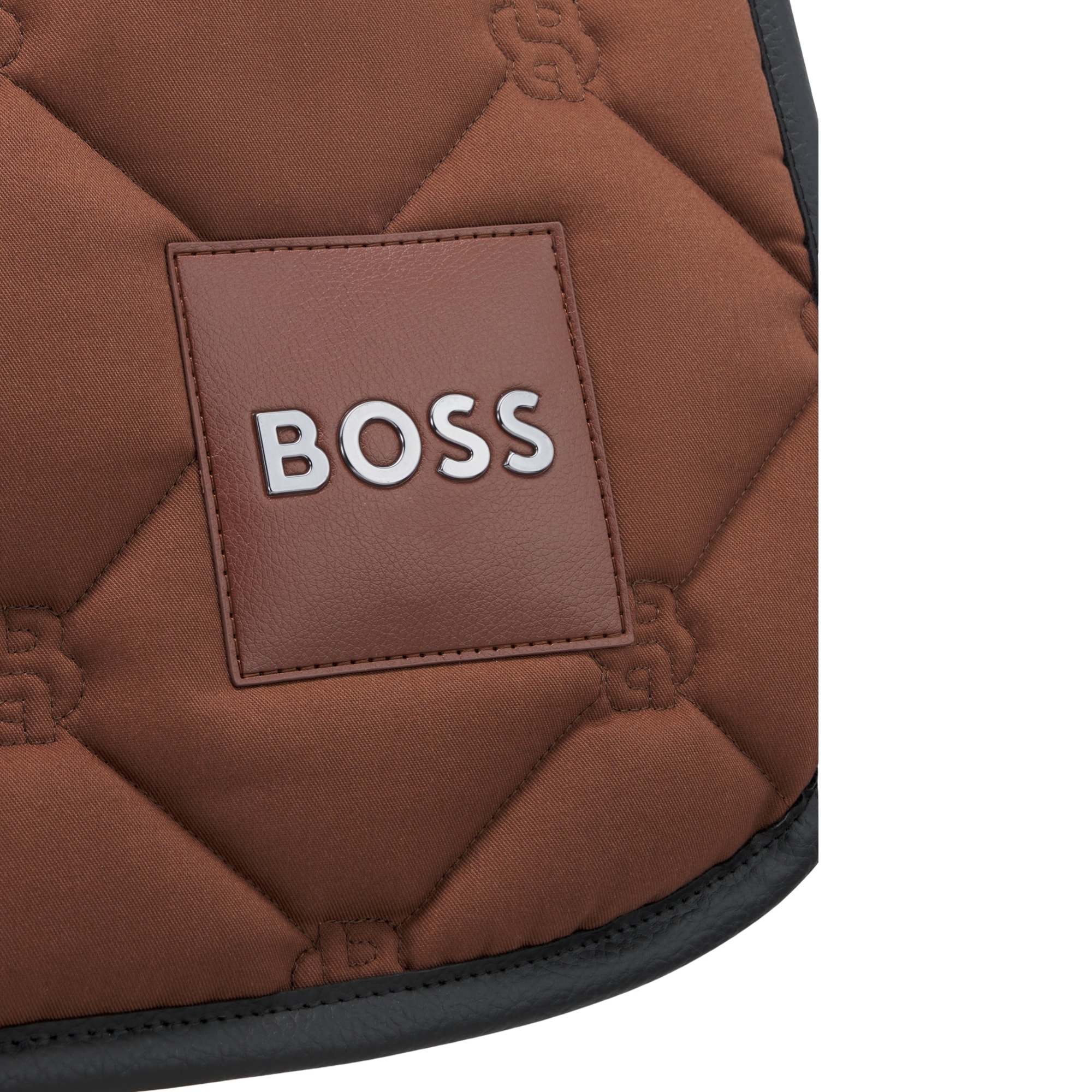 Elegante Dressurschabracke in der Farbe Cappuccino von Boss Equestrian, aus feuchtigkeitsableitendem Material mit extra dicker Steppung und hoher Widerristfreiheit für eine perfekte Passform. Verziert mit eingestickten Double B-Monogrammen und einer Logo-Applikation aus elegant beschichtetem Synthetikmaterial.