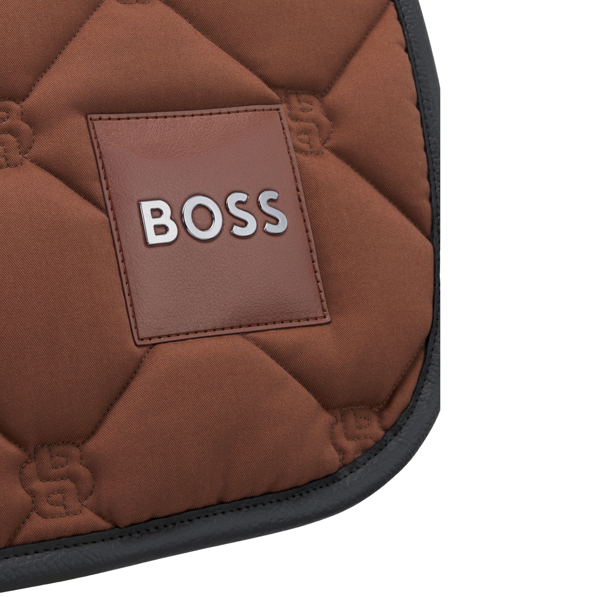 Elegante Springschabracke in der Farbe Cappuccino von Boss Equestrian, aus feuchtigkeitsableitendem Material mit extra dicker Steppung und hoher Widerristfreiheit für eine perfekte Passform. Verziert mit eingestickten Double B-Monogrammen und einer Logo-Applikation aus elegant beschichtetem Synthetikmaterial.