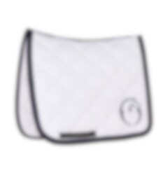 Die Chicago Dressurschabracke ist gepolstert und hat eine Innenseite aus 100 % Baumwolle, die atmet und Feuchtigkeit transportiert. Das Außenmaterial besteht aus 89 % Polyamid und 11 % Elasthan. Vestrum-Logo in marineblauer Kontrastfarbe auf der linken Seite der Schabracke.