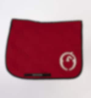 Diese Schabracke ist weinrot mit einem schwarzen Rand und einem hellen Logo. Perfekt, wenn Sie und Ihr Pferd besonders schick sein wollen!