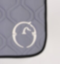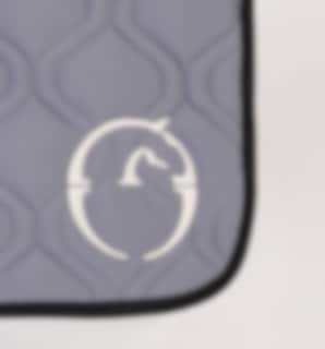 Diese Schabracke ist grau mit einem schwarzen Rand und einem hellen Logo. Perfekt, wenn Sie und Ihr Pferd besonders schick sein wollen!