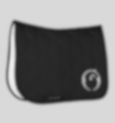 Diese Schabracke ist schwarz mit einem schwarzen Rand und einem hellen Logo. Perfekt, wenn Sie und Ihr Pferd besonders schick sein wollen!