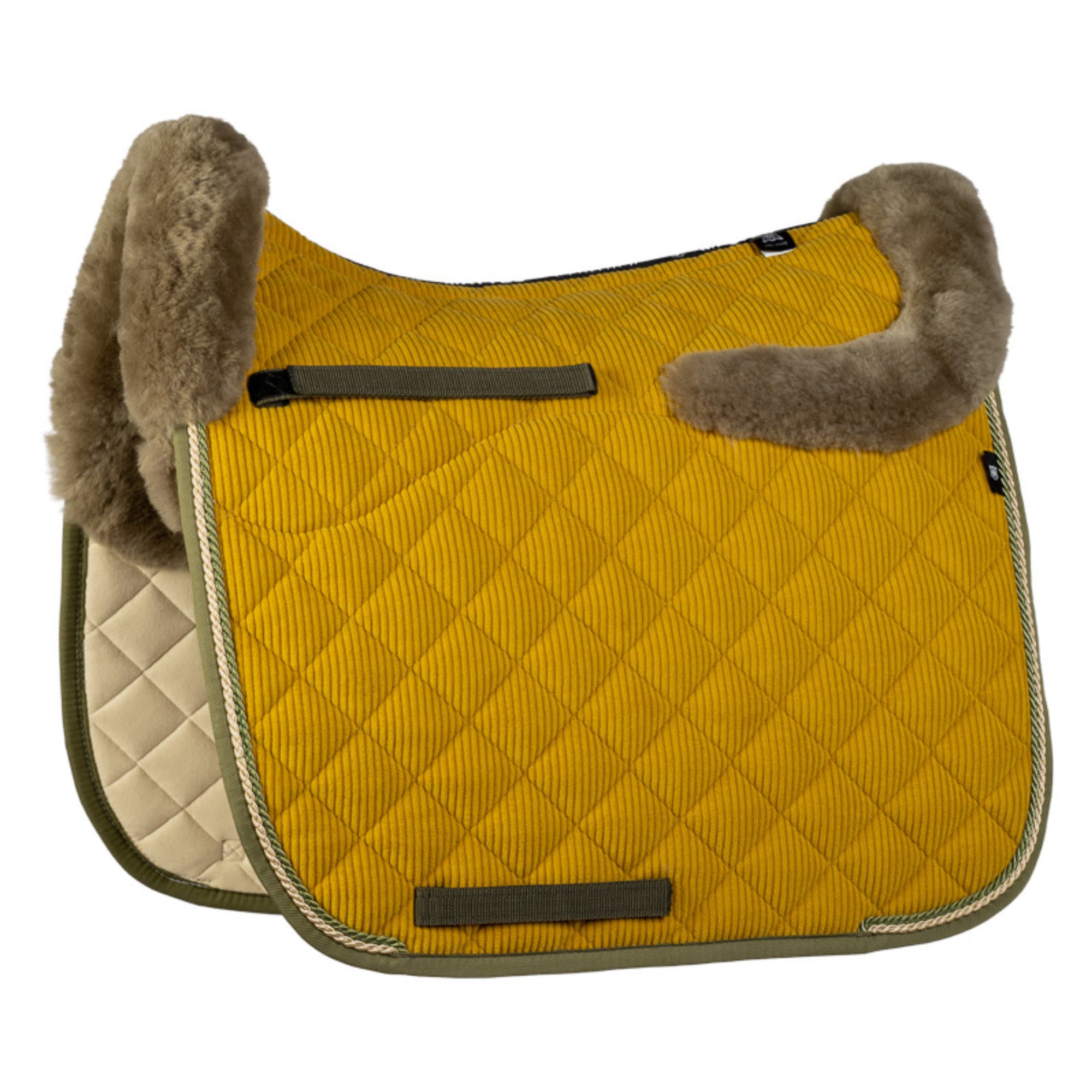 Die Lammfellschabracke ist in einem senfgelben Farbton „Curry“ mit Lammfell in der Farbe „Schlamm“ und zwei wunderschönen Zierkordeln entlang des Randes gefertigt.