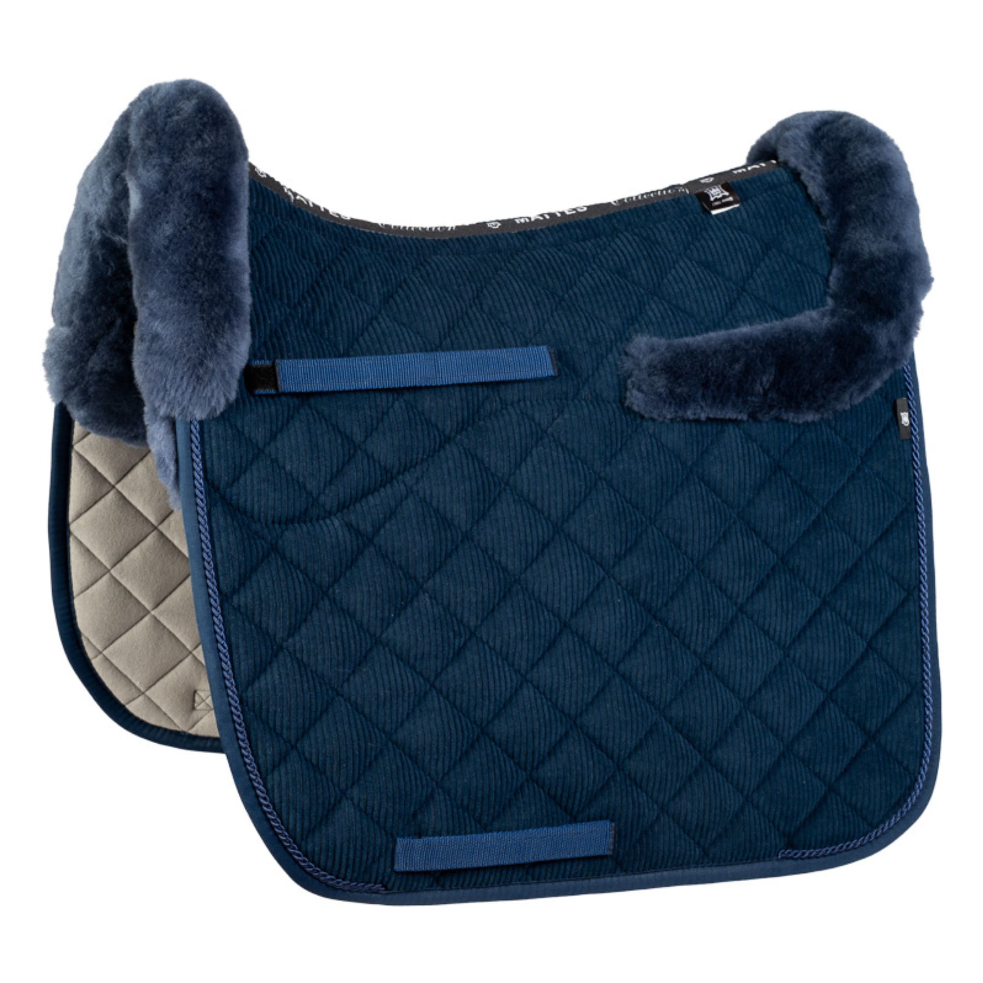 Dies ist eine Lammfellschabracke von höchster Qualität mit integrierter Lammfellunterlage im Inneren. Die Fellkanäle verlaufen beidseitig entlang der Wirbelsäule sowie um das vordere und hintere Sattelpolster. Das Lammfell hilft, den Druck gleichmäßig zu verteilen und Feuchtigkeit vom Pferd wegzuleiten. Die Oberseite der Schabracke besteht aus hochwertigem Manchesterstoff.