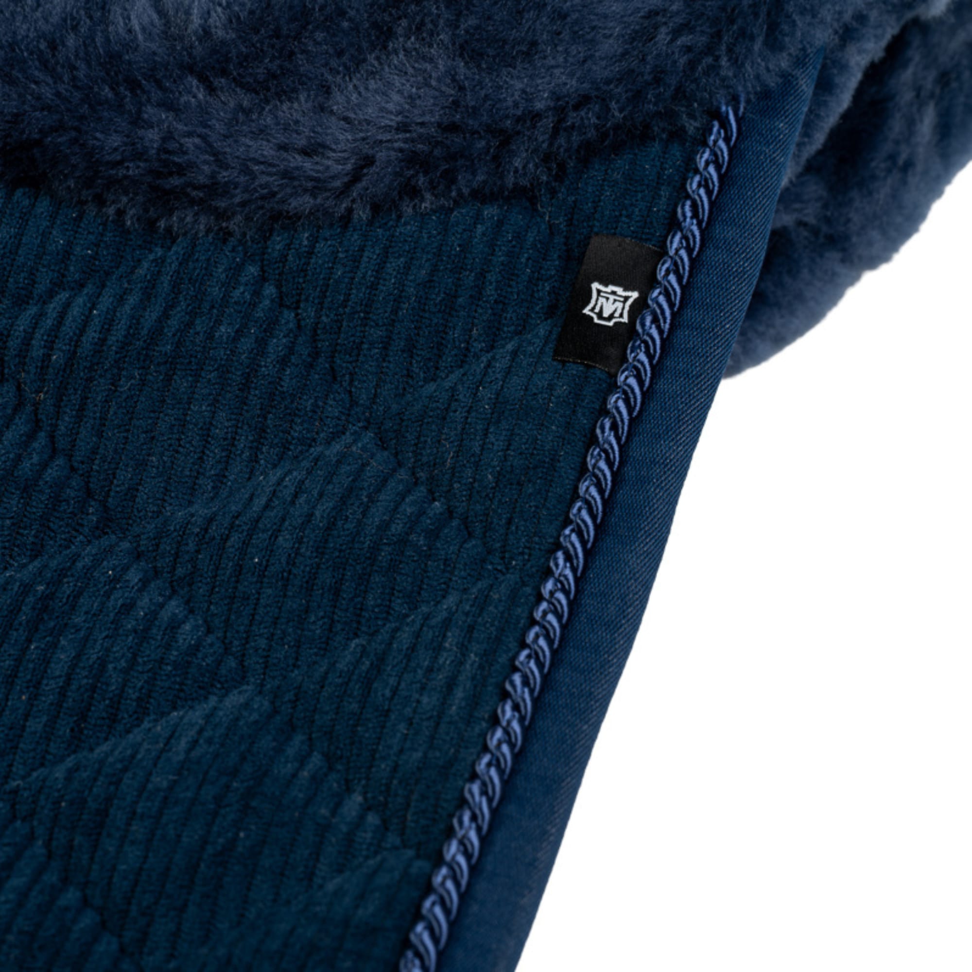 Die Lammfellschabracke ist in der Farbe Marine mit Lammfell in Blau und einer wunderschönen Zierkordel entlang des Randes gefertigt.