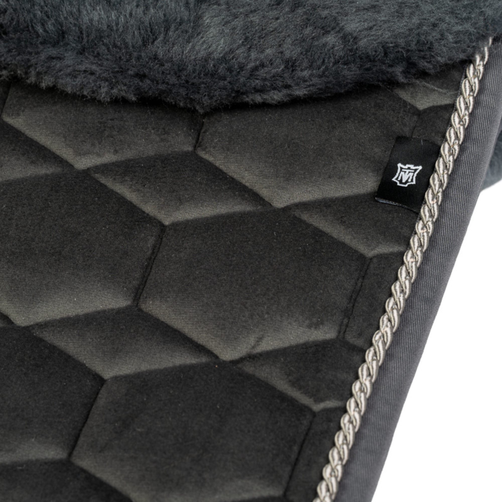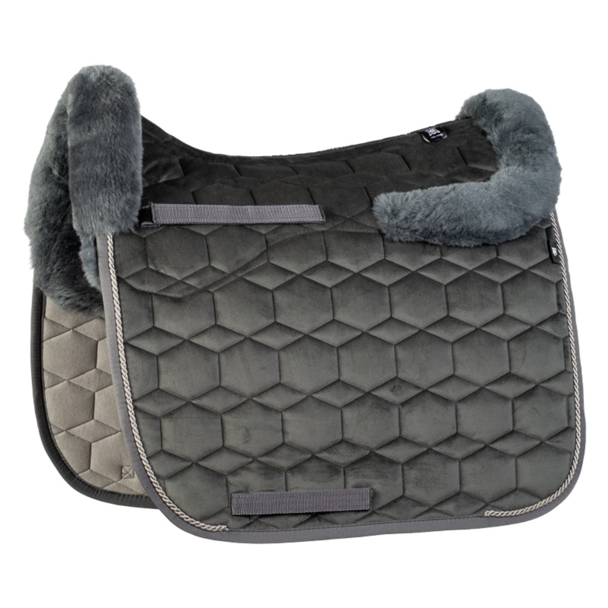 Die Lammfellschabracke ist in der Farbe Graphit mit Lammfell in Dunkelgrau und einer wunderschönen Kordel entlang des Randes gefertigt.