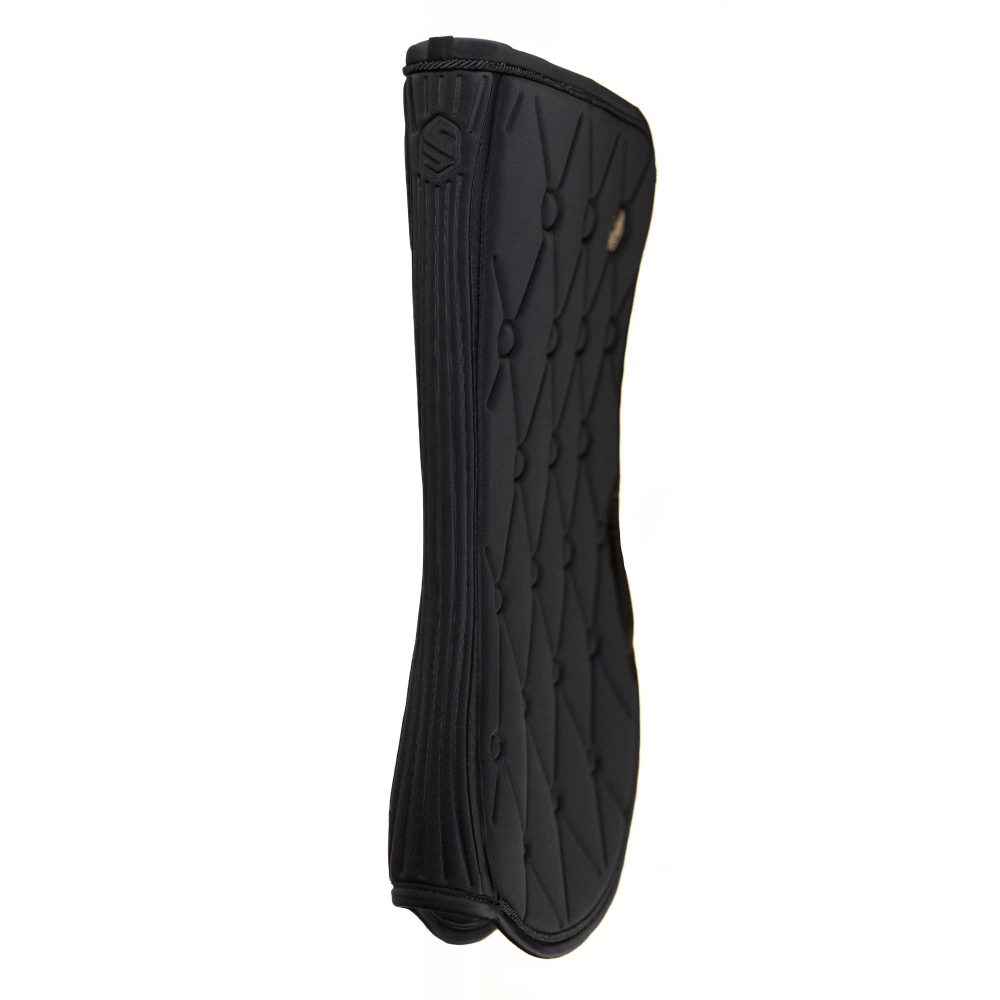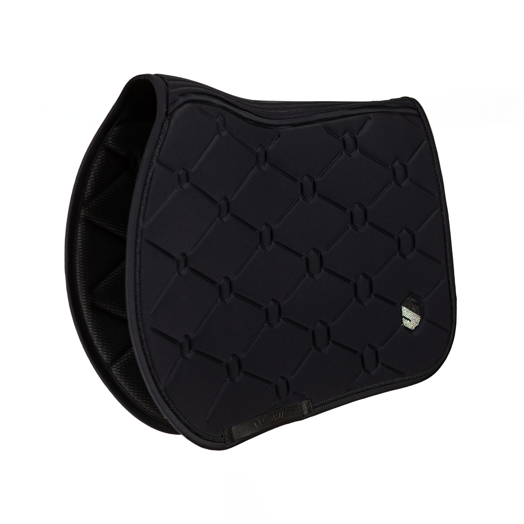 Luxuriöse schwarze Springschabracke von Samshield mit exklusiven Swarovski-Kristallen, die das Logo zieren. Anatomisch geformt für optimalen Komfort, stoßdämpfendes Material und perfekte Passform.