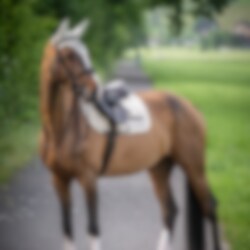 Die Schabracke verfügt über eine feuchtigkeitsableitende Füllung, die während des Reitens effektiv Feuchtigkeit ableitet, sowie über eine hohe Widerristform, die für eine optimale Passform unter dem Sattel sorgt.