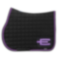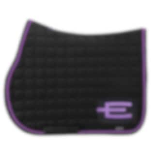 Die Springschabracke besteht aus hypoallergener Baumwolle, die so behandelt wurde, dass sie nach dem Waschen nicht einläuft. Diese Springschabracke ist schwarz mit schwarzem Rand, lila Zierkordel und E-Logo in lila/schwarzem Glitzer.