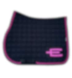 Die Schabracke besteht aus hypoallergener Baumwolle, die so behandelt wurde, dass sie nach dem Waschen nicht einläuft. Diese Springschabracke ist Schwarz mit Schwarz Einfassung, rosa Zierkordel und rosa/schwarzglitzerndem E-Logo.