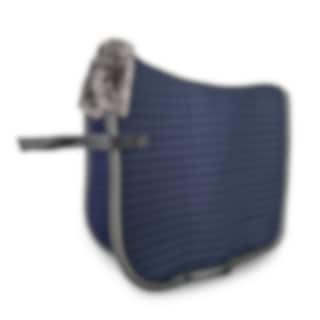 Die Dressurschabracke folgt der Show-Line-Serie mit einem auffälligen kontrastierenden Piping in Grau, das einen schönen Kontrast zur marineblauen Farbe der Schabracke bildet.