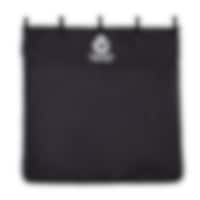 Schwarzer Boxentürvorhang in stilvollem Design mit Cavalleria Toscana-Logo in weißer Stickerei. Vier Haken erleichtern die Montage des Vorhangs in der Türöffnung der Box.