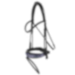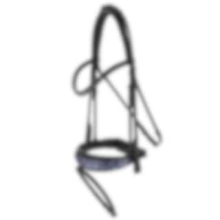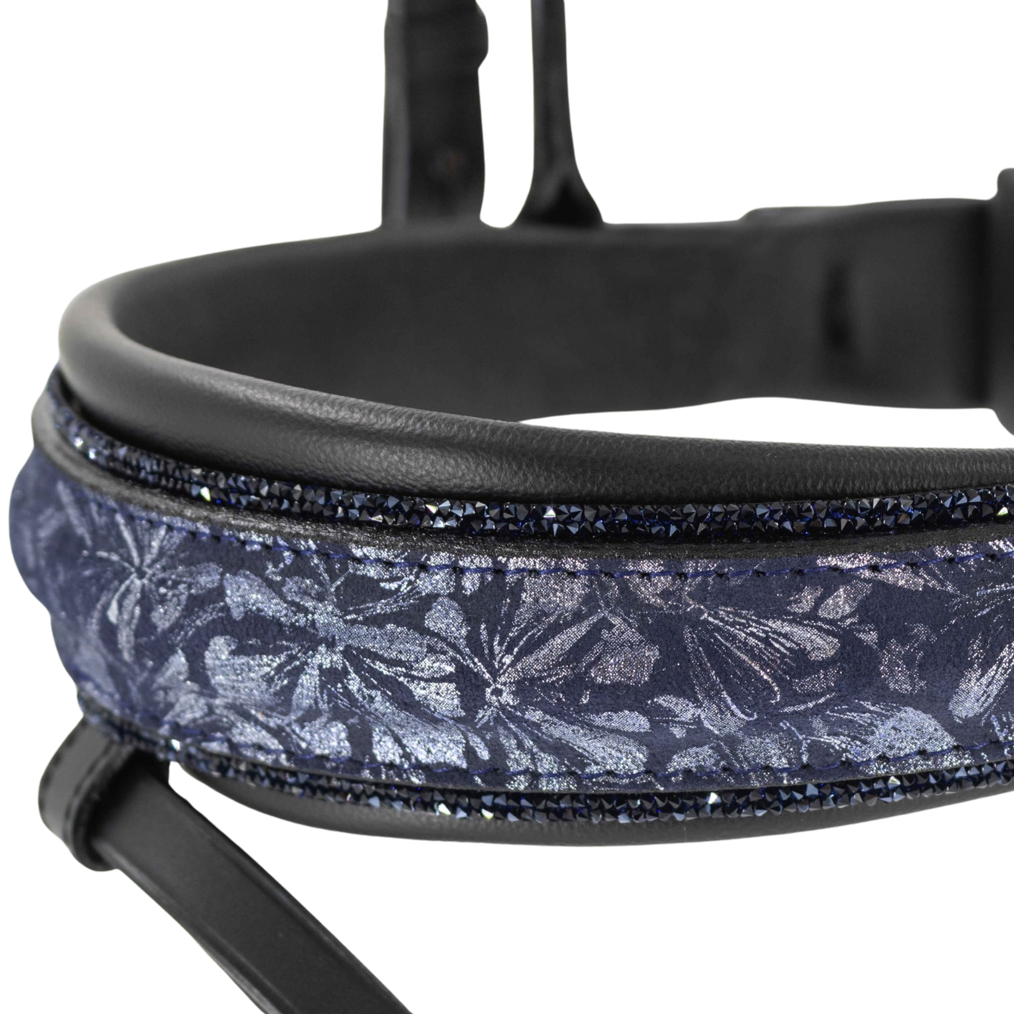 Das Reithalfter ist einzigartig dekoriert mit einem eleganten Blue Metallic Flower Print sowie einer feinen Fineline Paspelierung in Midnight Blue.
