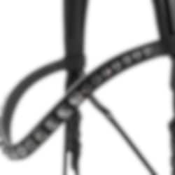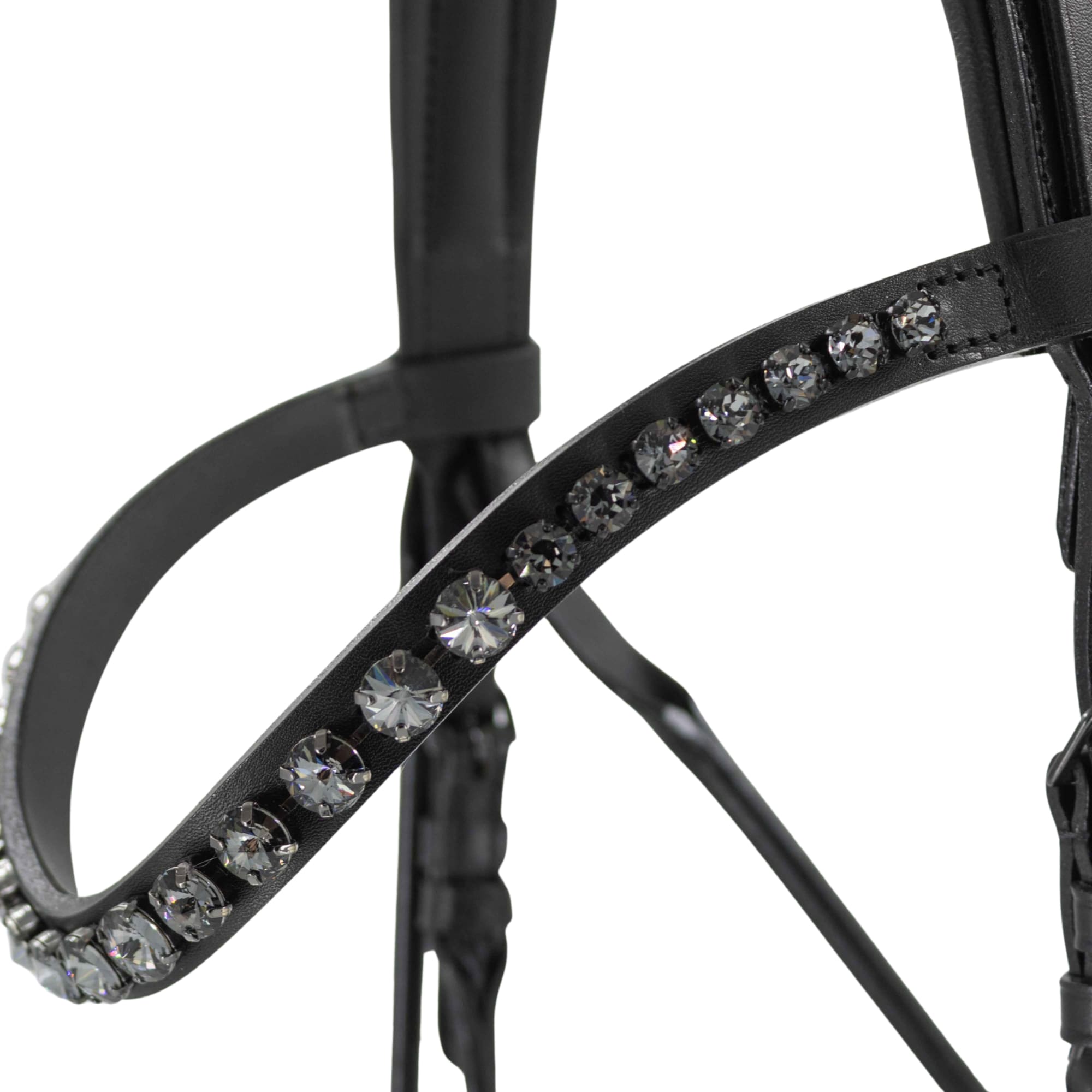 Das schöne Stirnband ist im Modell FOCUS gefertigt, ein geschwungenes Lederstirnband mit grossen Swarovski Kristallen in der Farbe Silver Night B in unterschiedlichen Grössen. An den Seiten befinden sich die kleineren Steine mit 8 mm, gefolgt von 10 mm Steinen, während in der Mitte 12 mm grosse Steine eingesetzt sind. Diese Anordnung ist ein weiteres Detail, das dem Trensenzaum einen besonders exklusiven und auffälligen Charakter verleiht. Die Fassung ist schwarz und harmoniert perfekt mit den schwarzen Beschlägen.