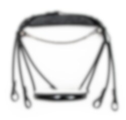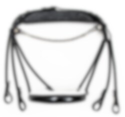 Ein anatomisch und rundgenähter Kandarenzaum mit einem einzigartigen Genickstück, das Druck- und Muskelschäden in den Hals- und Nackenmuskeln des Pferdes vorbeugt. Der Kandarenzaum ist mit einem dünnen Stirnband mit schicken silbernen Vierecken ausgestattet.